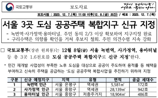 안녕하세요. 오늘은 오늘 2023년 12월 8일에 서울시에서 발표한 [서울 도심 3곳 공공주택 복합지구] 신규지정 3곳에 대해서 알아보도록 하겠습니다.
