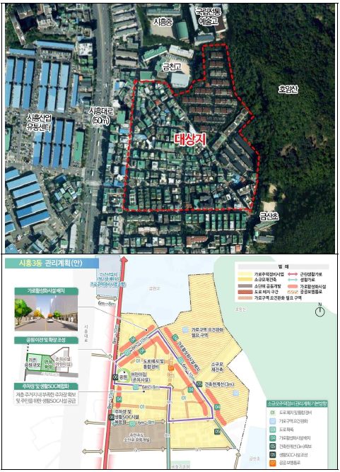 | 금천구 시흥 3동, 5동 일대 | 미확인 | 제1종일반주거 | 3구역 > 약 86,705㎡ / 26,274평 5구역 > 약 89,944㎡ / 27,256평 |