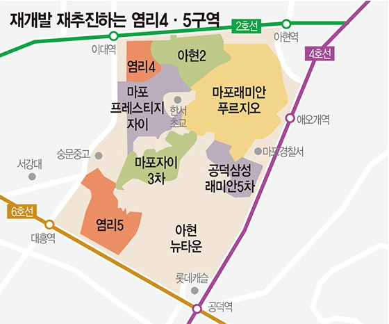 2003년 지정된 아현뉴타운 재정비촉진지구의 일원인 ‘염리4,5구역’은 좋은 입지에도 불과하고 수년째 답보상태에 있습니다. 뉴타운 해제 이후 지역주택조합(신촌호빗써밋-가칭)과 가로주택정비사업 등 여러 재개발 사업으로 나눠졌기 때문이라는 의견이 있습니다.
