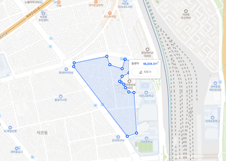 성북구 석관동 124-42 일원은 노후도가 78%로 기존 주택재건축 정비예정구역이 해제된 이력이 있으며, 주변 인근 지역에 비해 그동안 개발이 되지 않아 슬럼화된 지역입니다. 석관동 124-42 일원은 석관고1구역. 2구역.3구역 세개로 나누어져 있는데, 세개구역 포함 면적으로 이번에 모아타운 공모에 접수하여 션정되었습니다.