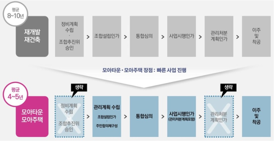 모아타운은 정비계획 수립. 추진위 승인, 관리처분 인가 등 총 3단계 절차가 생략되어 기존 재개발 방식이 10년 이상 걸리는 기간을 최대 4-5년까지 단축 시켜 빠르게 진행하게 됩니다.